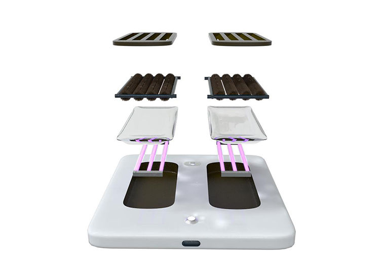 “E-Tapis” (Hao Wang y Hanyuan Hu, China): limpiador inteligente de suelas de zapatos mediante líquido desinfectante y luz ultravioleta.