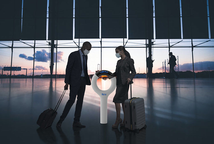 “OM” (Rafael Vinader, España): tótem sanitario con dispensador automático de gel hidroalcohólico desinfectante y termómetro por infrarrojos.