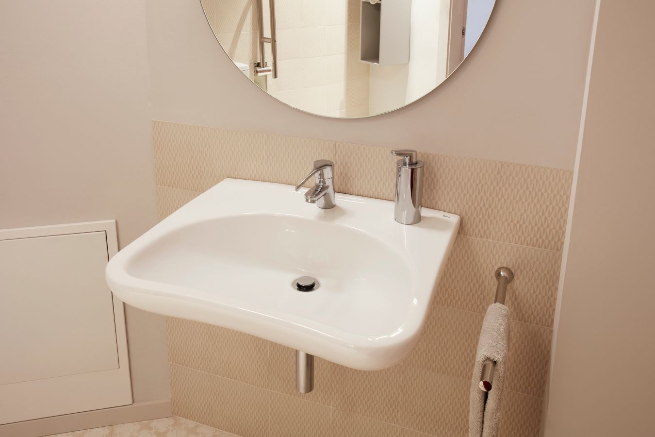 The bathroom on the first-floor features Roca fixtures selected from the Access and Victoria Pro collections, and were chosen for their ergonomic, versatile and sophisticated solutions. Among the fixtures featured are a folding grab bar with built-in toilet roll holder, the Victoria Pro faucet with a specially crafted handle for individuals with reduced mobility, and the Access wall-hung basin.