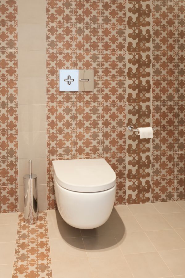 Roca’s Meridian wall-hung toilet’s minimalist design seamlessly complements the sleek look of the PL6 dual flush plate. Its easy-to-use chrome-finished controls offer maximum convenience and blend perfectly with other bathroom fixtures. The chrome finish adds a modern touch to the bathroom and creates a striking contrast with the brown floral design, elevating the overall design. When combined with accessories from the Hotels collection in the same chrome finish, it completes the look.
