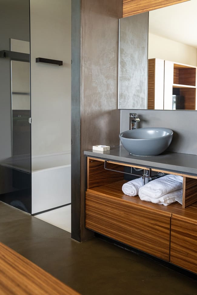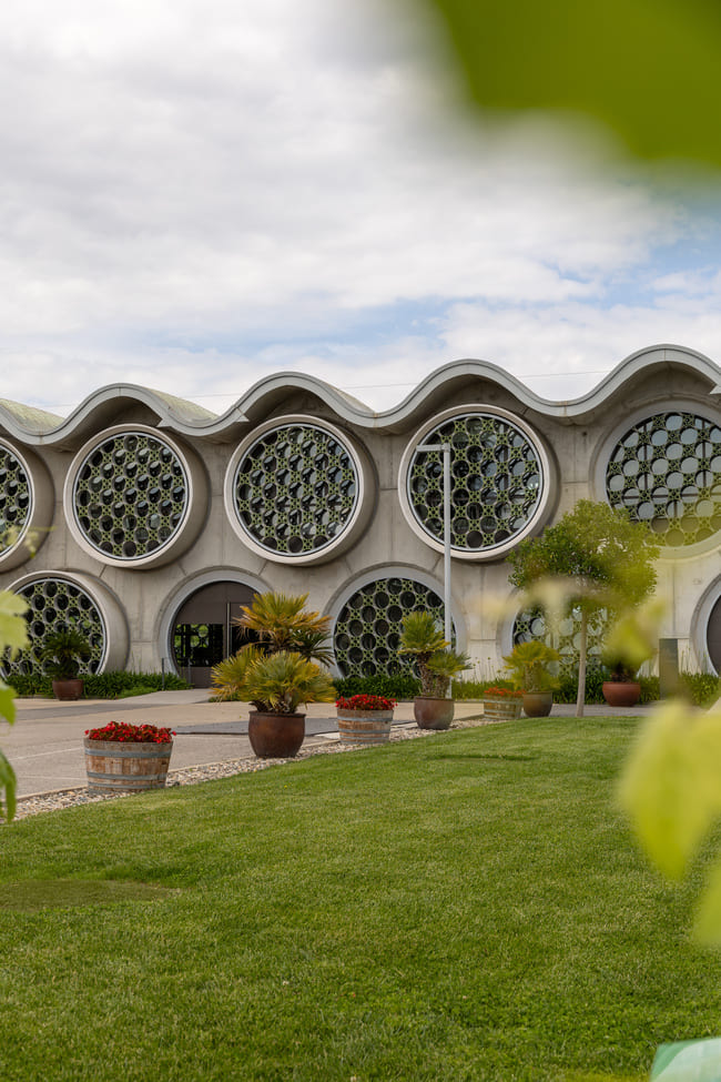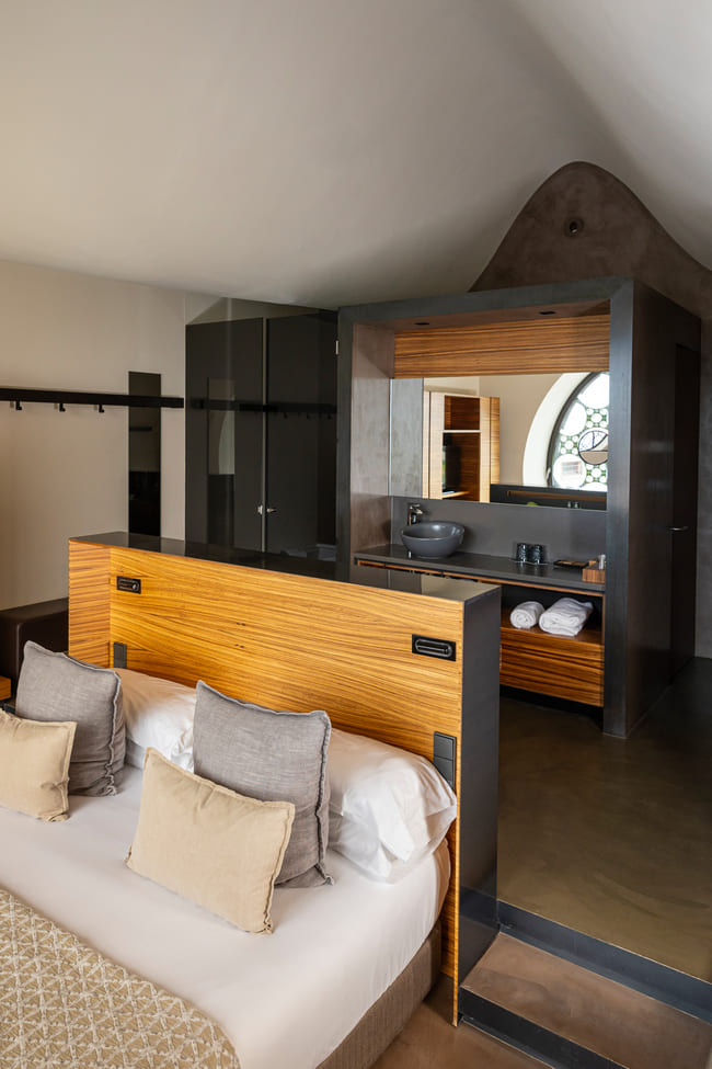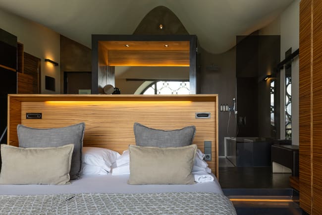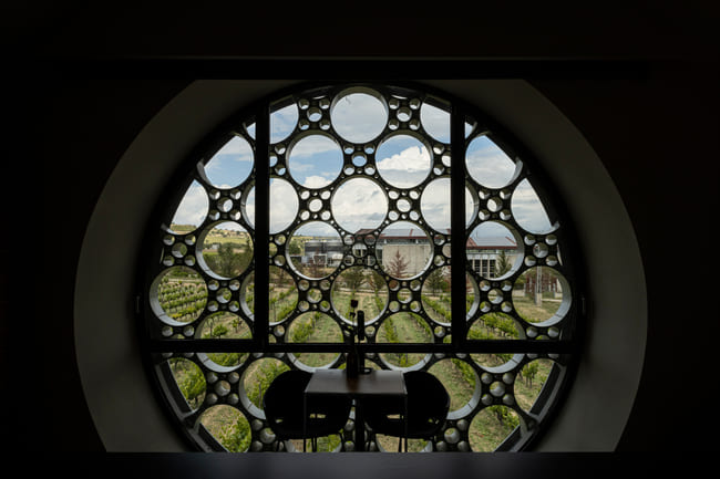 Inside, the hotel continues to draw inspiration from its natural surroundings. In the bedrooms, the sinuous lines of the building give way to smooth, curved ceilings that enhance the sense of space. Large, circular windows with geometric patterns allow natural light to flood the rooms, offering breathtaking views of the vineyards. The use of wood, glass and black accents creates a cohesive and stylish look that balances contemporary design with natural elements.