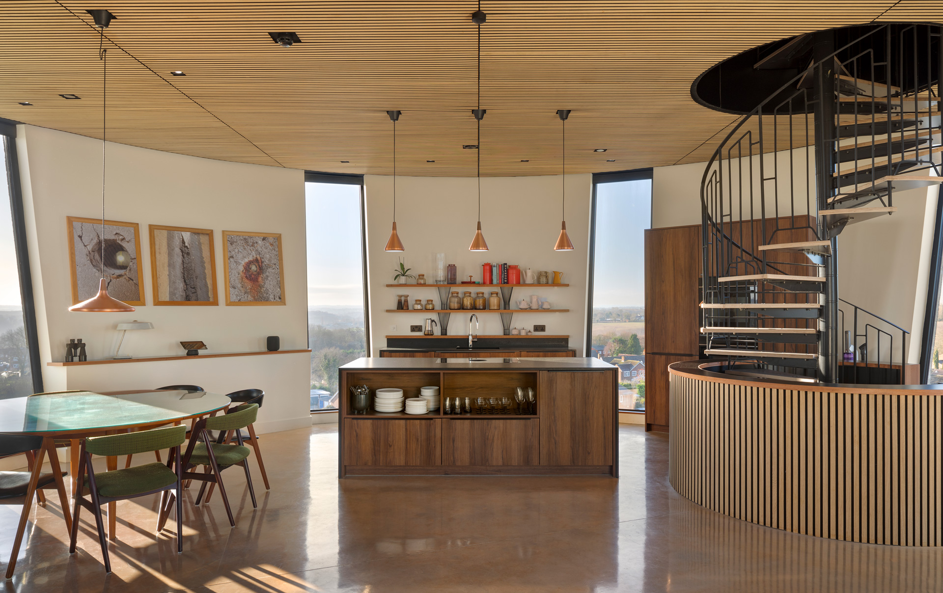 Located in Hertfordshire, just 30 minutes from London’s St Pancras, the 23-meter boutique retreat, comprises over 160 square-meters of living space across multiple levels, accessible by two hand-built spiral staircases. The renovation preserved the tower’s brutalist heritage while infusing it with modern design, energy efficiency, and multi-generational usability. With restored Danish and British furniture and cabinetry, the tower's interiors embrace comfort, design, and purpose. The conversion also complies with current environmental standards, including BREEAM certification.